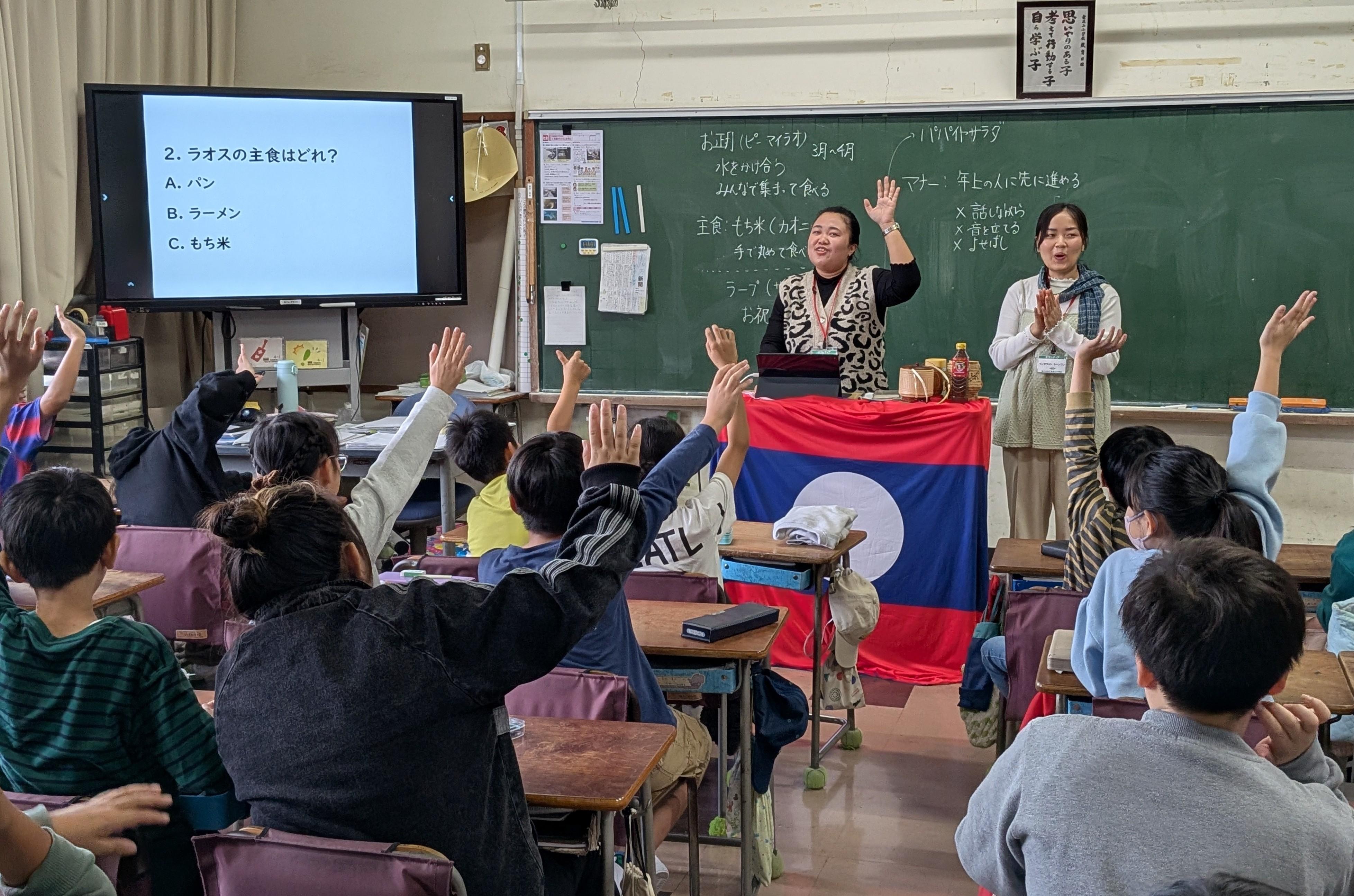 10月のSAFCA寄付講座2日目は、ラオスの食文化について、2名の当公益財団留学生寮のラオスからの大学院生(修士課程2名日本語に関する研究)が、地域の小学生に「やさしい日本語」で母国を紹介。
